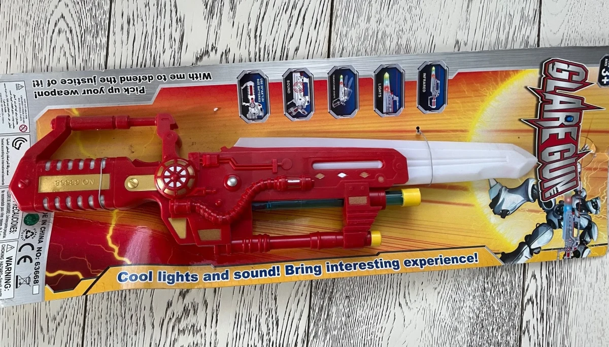 Игрушка Бластер свет, звук на планшете 53х18 см. Размер бластера 44х12 см.
