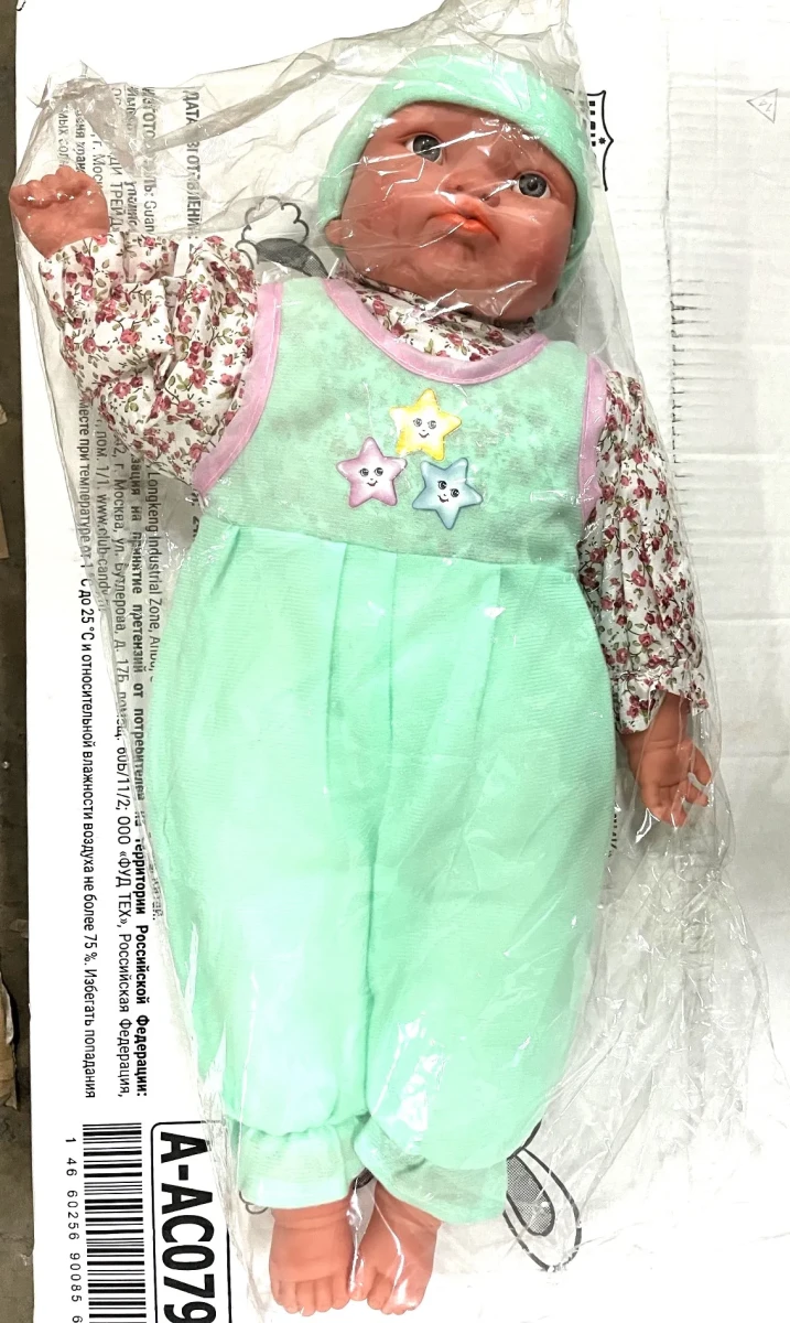 Кукла озвученная 53 см в пакете. Мягконабивная с элементами из пластмасс. Работает от батареек. Для детей старше 3 лет.